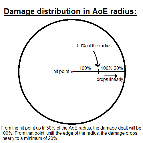The second damage type is the secondary damage, also known as AoE or burst damage. It applies to all components in AoE radius subsequently after the direct damage. Amount of AoE damage is dependent of range to epicenter. Full AoE damage is applied inside 50% of the AoE radius, then the damage drops linearly from 100% to 20% on the other edge of the radius.