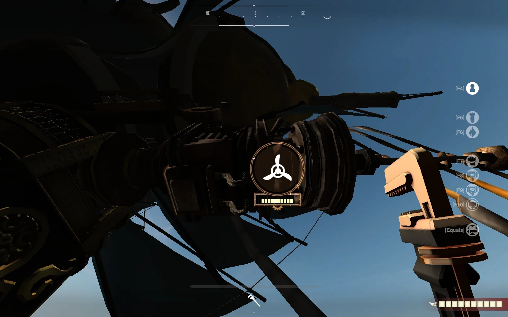 - The main engine is located at rear end of upper deck, above the balloon component. It can be repaired from below by jumping onto the rails surrounding the balloon from behind, to avoid a longer way from lower deck to upper deck by ladders. Note, from below, the point of repair can don't show to player from some angles, but maintenance is still possible (no LMB hold available in this case).